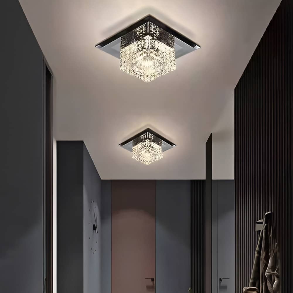 This modern crystal ceiling lamp features a striking geometric design with a modern flair. This square ceiling light has a glass base that subtly reflects light and adds warmth to the fixture. Suspended at the center is a clear textured crystal cube, giving the LED hallway ceiling light a sparkling, prismatic effect when illuminated. The contrast between the square glass base and the clear crystal cube creates a layered, dimensional look that is both elegant and contemporary, ideal for compact spaces like hallways or entrance hall.