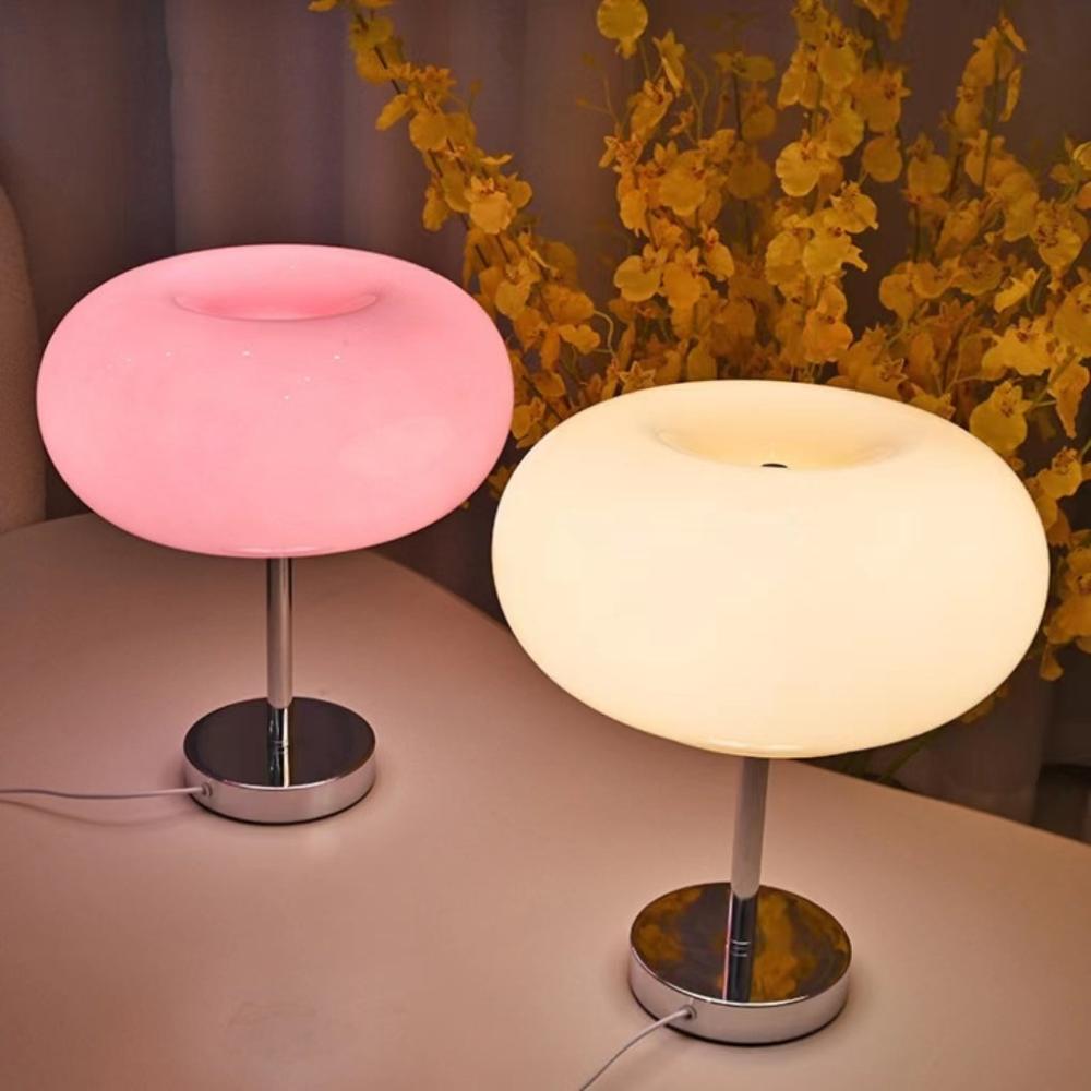 Add a playful yet sophisticated touch to your space with the Modern Bauhaus Donut Glass Table Lamp. Featuring a round donut-shaped glass lampshade, this Art Deco Table Lamp is available in pink, white, and beige. The LED light source ensures energy efficiency, and the sturdy iron base prevents tipping, this Creative Table Lamp combines practicality and elegance.