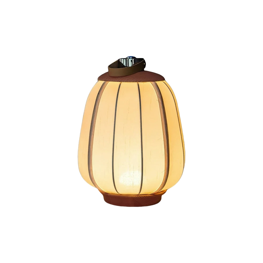 Inspired by traditional Japanese lanterns, this LED portable table lamp features a rounded fabric lampshade with vertical dark lines accentuating its sculptural form. Accented with wood and a convenient handle, this Japanese table lamp seamlessly blends natural materials with modern functionality. Its rechargeable design allows for cordless use, making it both portable and stylish.