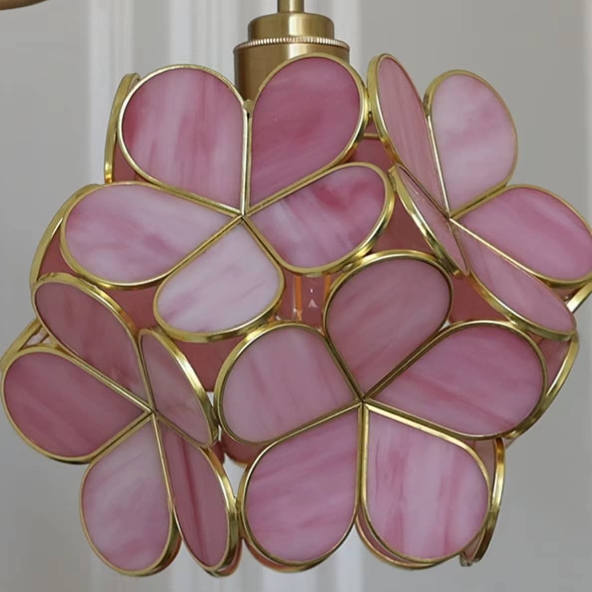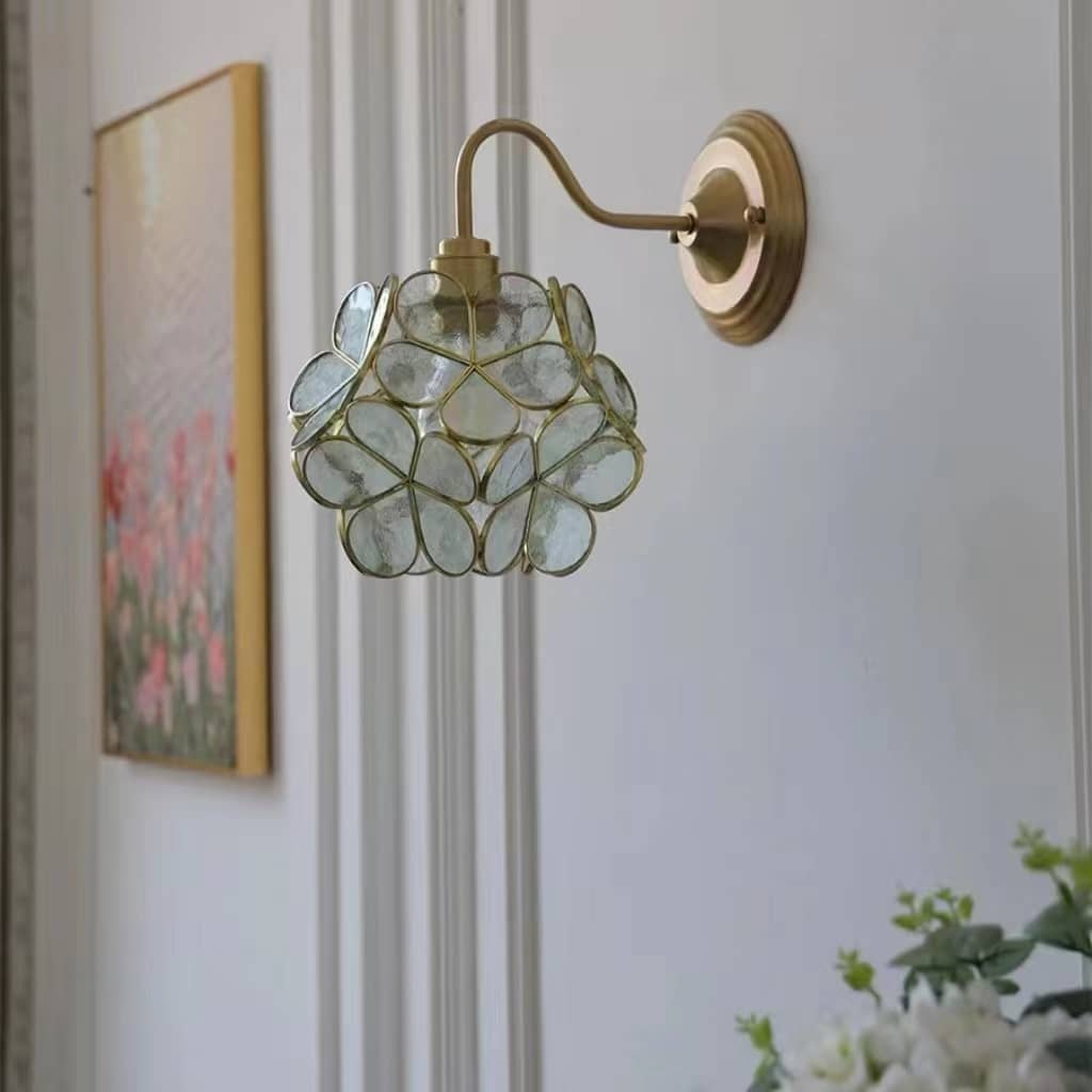 Add a touch of vintage romance to your space with this enchanting romantic wall light that glows with delicate charm. Crafted from stained glass petals framed in golden metal, this flower wall sconce forms a blooming hydrangea-like silhouette. Mounted on a gracefully curved brass-finished arm and round backplate, this vintage style wall sconce is perfect for bedrooms, hallways, or living rooms—offering both decorative beauty and ambient illumination.