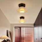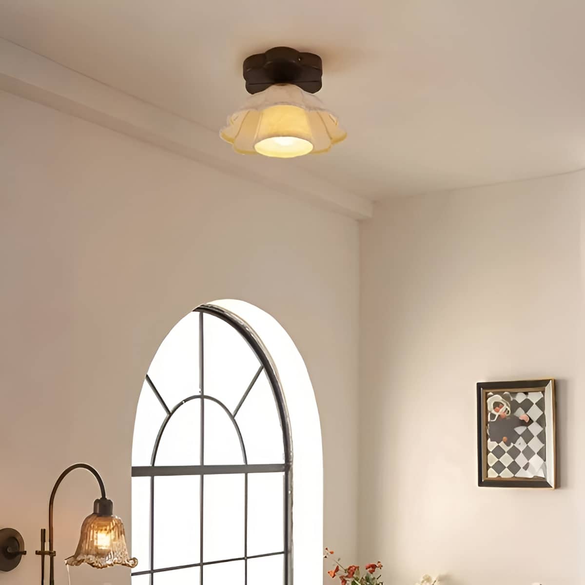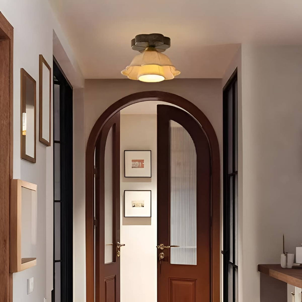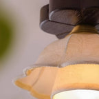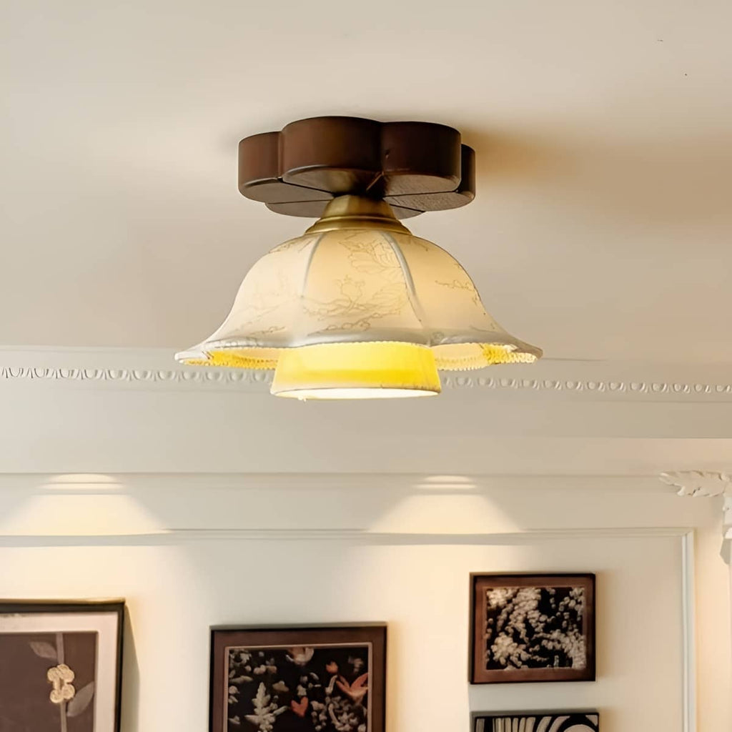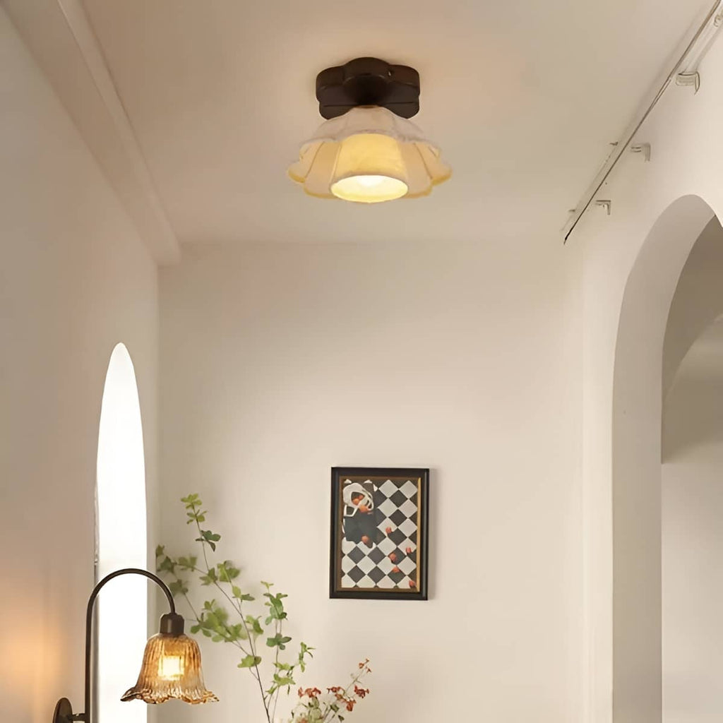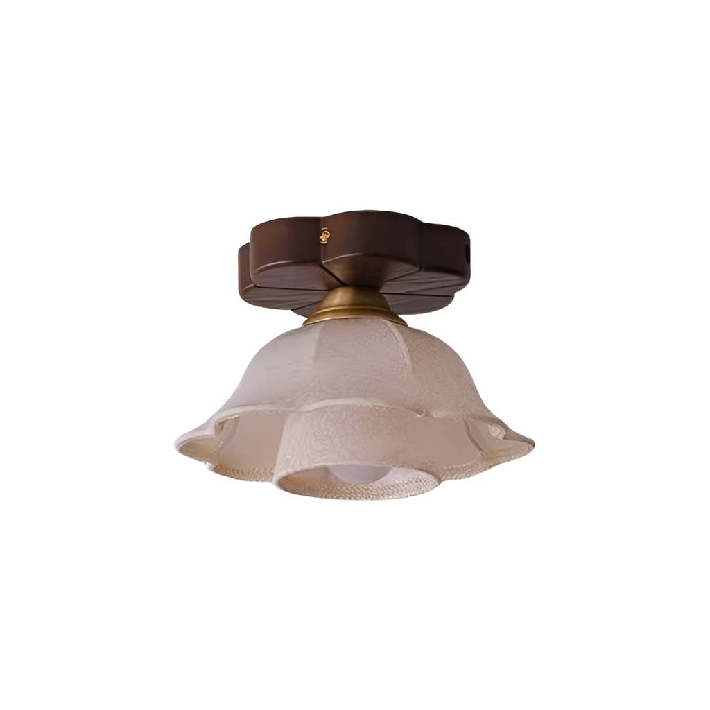 This small ceiling light features a charming vintage-inspired design with a flower-like silhouette. The fabric shade of this retro style ceiling light is decorated with wavy petals that gently flare outwards, like the elegance of a blooming flower. The shade is mounted to a walnut toned wooden ceiling base, adding a touch of rustic sophistication. The combination of organic curves, and delicate detailing gives the art deco ceiling light a nostalgic, romantic appeal, perfect for classic, cottage, or retro-style interiors.